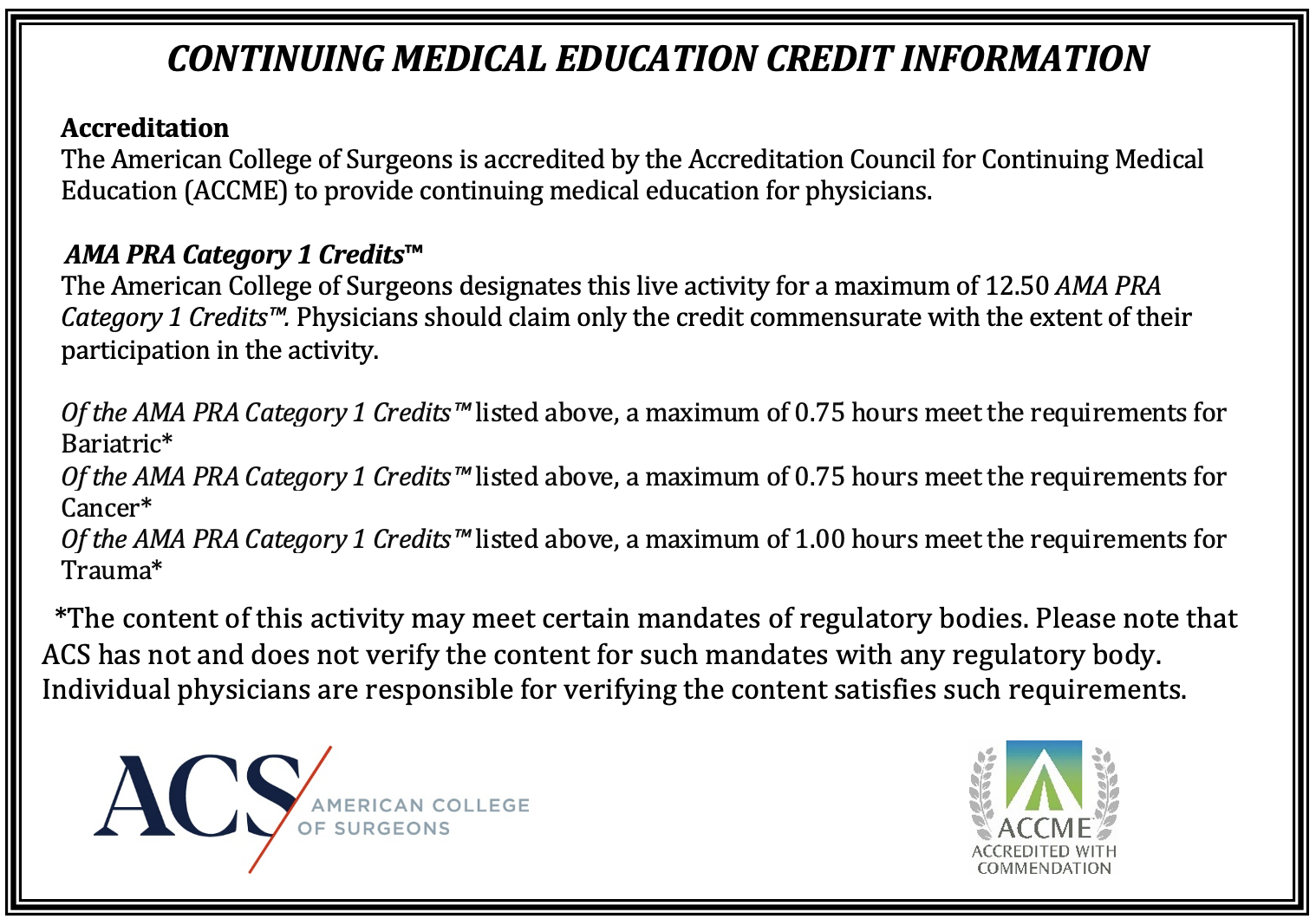 - Concurrent Session: Surgical Potpourri & Trauma & Critical Care (trauma mandate .5 hour): .5 credit